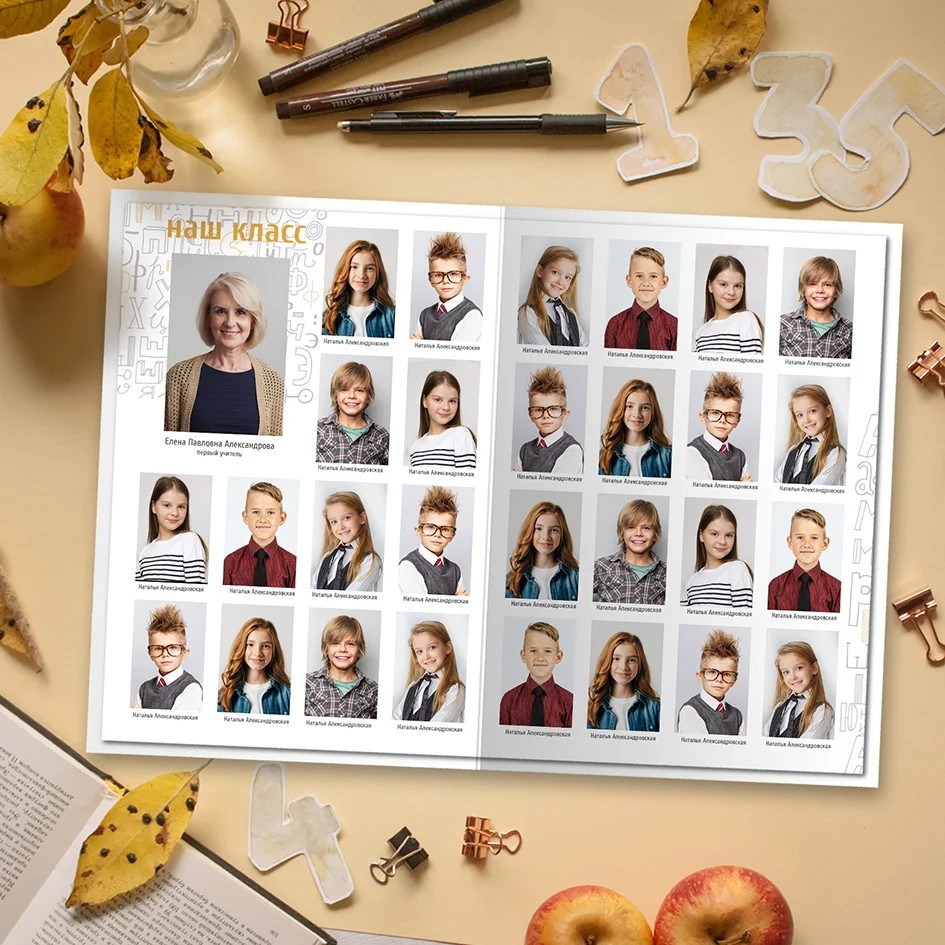 1 разворот — виньетка (фото детей и классного руководителя с именами)