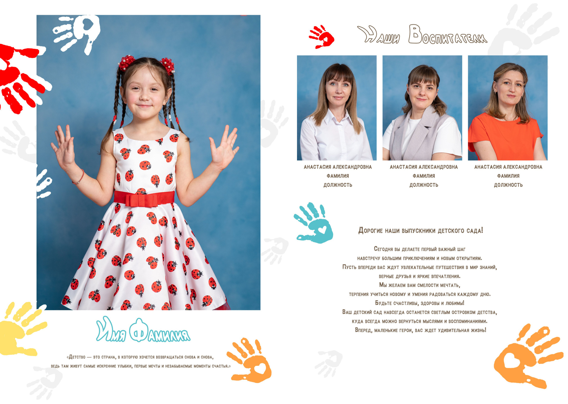 1 — воспитатели и портрет ребёнка с цитатой